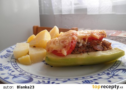 Zapečená cuketa plněná mletým masem a sýrem. Dužinu z cuket nakrájíme na kostičky, přidáme k masu a osolíme. Na lžíci olivového oleje dozlatova opečte cibuli, přidejte sušená rajčata a vše nechte.