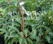 Thin and quite long deep green leaves are quite dark and area striking addition to the. Glossy dark green ovate leaves are smaller than the species form a dense bush. Scented white flowers are followed by red fruit ripening black.